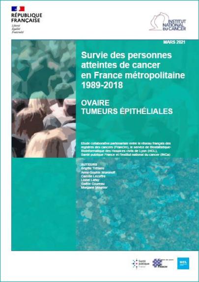 En France, pour l'année 2018, le nombre estimé de nouveaux cas de tumeurs épithéliales invasives de l'ovaire était de 4 531. À retenir : Survie nette standardisée à 5 ans de 43 % pour les cas diagnostiqués entre 2010 et 2015 ; Amélioration de la survie nette standardisée à 5 ans de 13 points de pourcentage entre 1990 et 2015 (de 33 % en 1990 à 46 % en 2015) ; Amélioration de la survie nette à 5 ans plus marquée chez les femmes de 50 à 70 ans (+14 à +20 points de pourcentage entre 1990 et 2015) que chez celles 80 ans (+8 points de pourcentage) ; Pas d'amélioration de la survie nette à 10 ans entre 1990 et 2010 pour les femmes de 40 ans ; Survie à long terme : taux de mortalité en excès très bas chez les femmes qui ont survécu 5 ans après leur diagnostic de cancer épithélial de l'ovaire et qui reste stable jusqu'à 20 ans après le diagnostic.