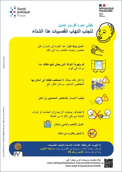How can bronchiolitis be prevented in children under 2 years of age? Illustrated poster developed in collaboration with professionals who work with vulnerable populations. Text in Arabic.