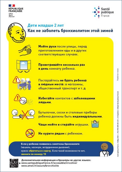 How can bronchiolitis be prevented in children under 2 years of age? Illustrated poster developed in collaboration with professionals who work with vulnerable populations. Text in Russian.