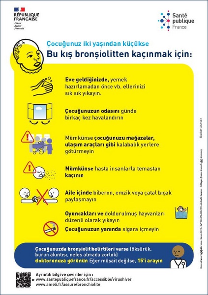 How can bronchiolitis be prevented in children under 2 years of age? Illustrated poster developed in collaboration with professionals who work with vulnerable populations. Text in Turkish.