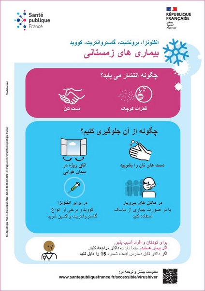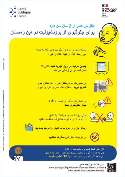 How can bronchiolitis be prevented in children under 2 years of age? Illustrated poster developed in collaboration with professionals who work with vulnerable populations. Text in Dari.