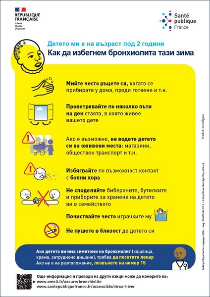 How can bronchiolitis be prevented in children under 2 years of age? Illustrated poster developed in collaboration with professionals who work with vulnerable populations. Text in Bulgarian.
