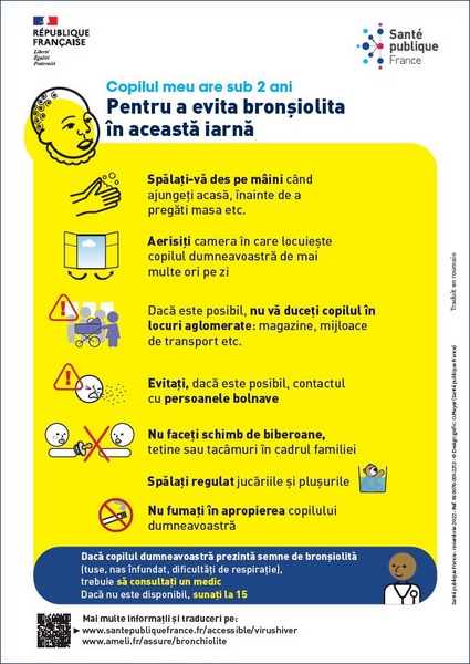 How can bronchiolitis be prevented in children under 2 years of age? An illustrated poster developed in collaboration with professionals who work with vulnerable populations. Text in Romanian.
