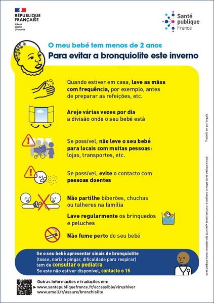 How can bronchiolitis be prevented in children under 2 years of age? Illustrated poster developed in collaboration with professionals who work with vulnerable populations. Text in Portuguese.