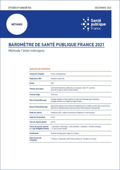 The survey methodology for the 2021 Santé publique France Barometer is based on the random generation of landline and mobile phone numbers. The survey population includes individuals aged 18 to 85 who reside in metropolitan France and speak French. The survey was conducted by telephone by the Ipsos Institute. It began on February 11, 2021, and ended on December 15, 2021. A total of 24,514 people aged 18 to 85, residing in metropolitan France and speaking French, participated. Seven out of ten interviews were conducted following the random selection of a mobile phone number, and three out of ten following the selection of a landline number. The response rate was 44.3%, with the questionnaire taking an average of 36 minutes to complete. This thirteenth edition of the Santé publique France Barometer was designed primarily to produce regional estimates for topics historically tracked in the Barometer (addictions, vaccination, nutrition). The large sample size planned for this purpose (24,514 people aged 18 to 85) was also intended to enable the production of estimates and interpretive insights on localized issues (such as pesticides, for example), rare events (such as suicidal behavior or musculoskeletal disorders), or specific populations (such as pregnant women or parents of young children). This edition also provided an opportunity to assess the health status of the French population after a year of the pandemic, particularly to take stock of the population’s mental health and to gather information on the settings where COVID-19 transmission occurred.