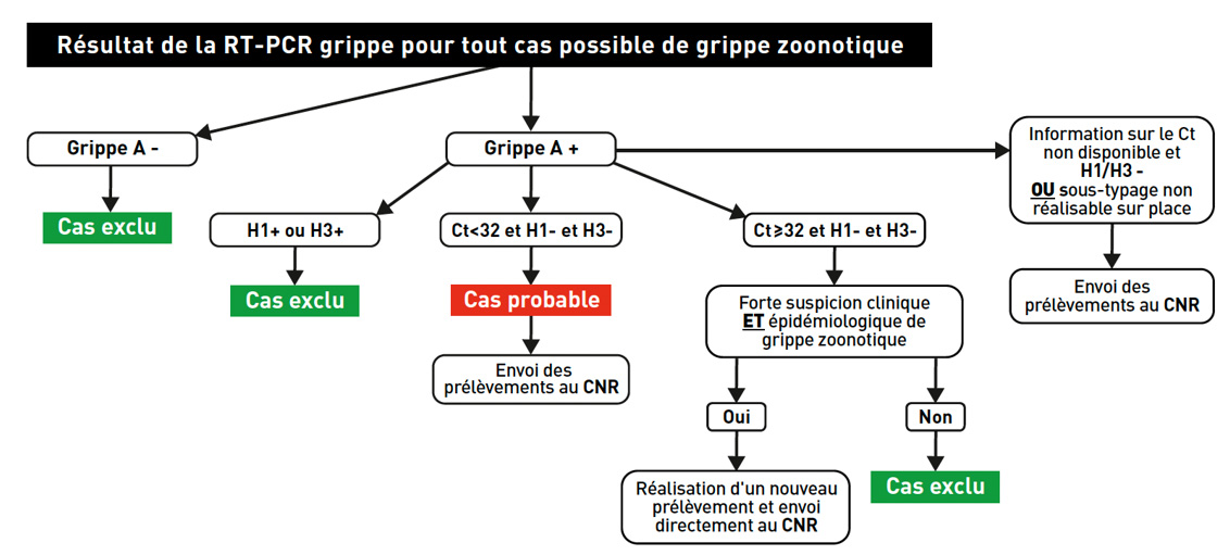 The physician must immediately report any patient meeting the definition of a probable case of avian influenza to the Regional Health Agency (ARS), which validates the patient’s classification as a probable case with Santé publique France. The opinion of a consulting infectious disease specialist and the CNR may be sought if necessary.