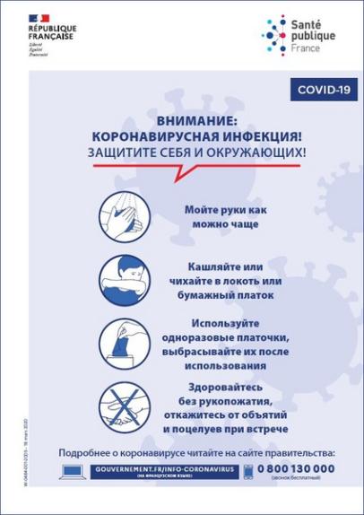 This poster in Russian illustrates the steps you can take to protect yourself and others from the coronavirus (COVID-19). Title: ATTENTION: CORONAVIRUS INFECTION! PROTECT YOURSELF AND THOSE AROUND YOU!