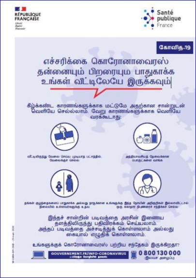 This Tamil-language poster, intended for the general public, advises people to stay home to protect themselves and others from the coronavirus (COVID-19), and specifies the circumstances under which travel is permitted.