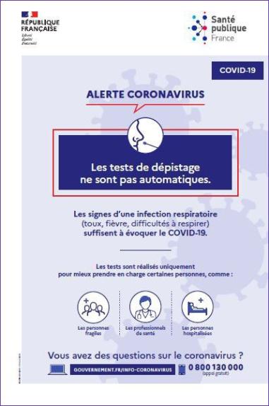 This poster explains that coronavirus testing is not automatic and specifies the circumstances under which it is conducted.