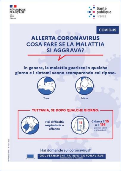 This poster in Italian explains what to do if you experience severe symptoms of the disease. Title: Coronavirus Alert: What to Do If Your Symptoms Worsen?