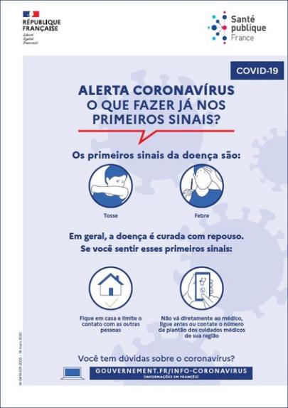 This poster in Portuguese outlines the early symptoms of the coronavirus and what to do if you experience them. Title: Coronavirus Alert: What to Do at the First Signs?