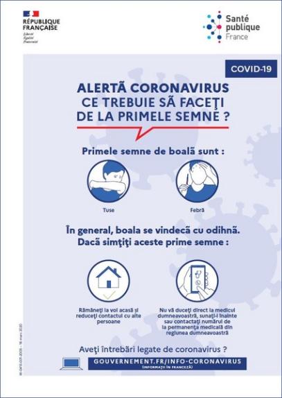 This poster in Romanian explains the early symptoms of the coronavirus and what to do if you experience them. Title: Coronavirus Alert: What Should You Do at the First Signs?
