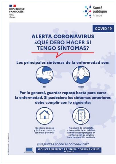 This poster in Spanish explains the early symptoms of the coronavirus and what to do if you experience them. Title: Coronavirus Alert: What Should I Do If I Have Symptoms?