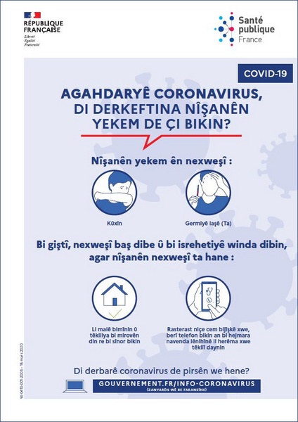 This poster in Kurmanji Kurdish illustrates the steps to take to protect yourself and others from the coronavirus (COVID-19).