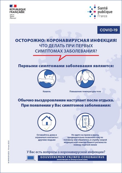 This poster in Russian illustrates the early symptoms of the coronavirus and what to do if you experience them. Title: WARNING: CORONAVIRUS INFECTION! WHAT TO DO IF YOU EXPERIENCE EARLY SYMPTOMS...