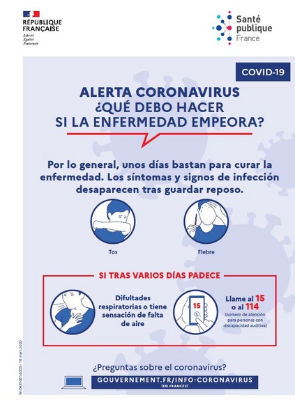This poster in Spanish explains what to do if you experience severe symptoms of the disease. Title: Coronavirus Alert: What Should I Do If My Symptoms Worsen?