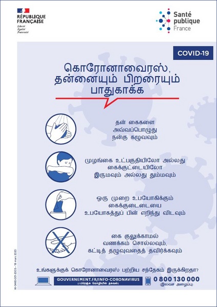 This poster in Tamil illustrates the steps to take to protect yourself and others from the coronavirus (COVID-19).