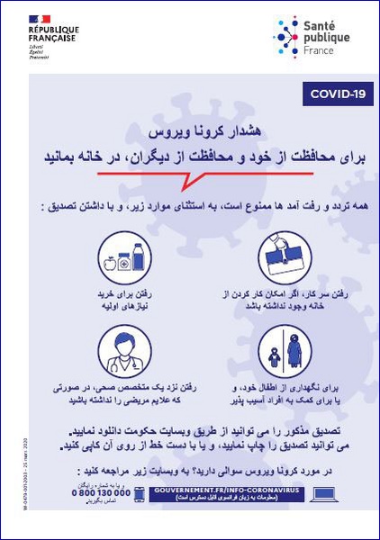 This poster in Dari, intended for the general public, advises people to stay home to protect themselves and others from the coronavirus (COVID-19), and specifies the circumstances under which...