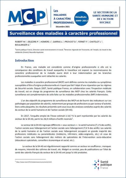An analysis of occupational disease data (OCD) for the period 2009–2017 among employees in the human health and social work sector reveals: 1- High prevalence rates of musculoskeletal disorders (MSDs) among women in this sector, a trend that has been sustained and long-standing, thereby underscoring the need to strengthen prevention efforts in this area; 2- High prevalence rates of irritations or allergies among female employees in human health; 3- Sharply rising prevalence rates of mental distress among female employees in the human health and social services sector. Our analyses reveal contrasting results across socio-professional categories; in particular, women employed in intermediate professions appear to be most affected by MSDs. This justifies conducting future analyses that prioritize a "job-specific" approach. Furthermore, in the context of the health crisis linked to the COVID-19 pandemic, which has heavily impacted workers in the human health sector, continuing the specific monitoring initiated in this report appears relevant and necessary. In terms of prevention, these results should support the implementation of tailored and targeted prevention initiatives within the SH-AS sector. It should be noted that the INRS (National Institute for Research and Safety on the Prevention of Occupational Accidents and Diseases) has developed numerous fact sheets, short films, and other resources intended for professionals in general, or for the SH-AS sector in particular, to reduce exposure to certain risk factors for the development or worsening of MSDs (e.g., assistance with material handling), irritations or allergies (protective equipment), and psychological distress. The results of the analyses conducted on SH-AS employees should thus help support the use of this type of material by local occupational health services.