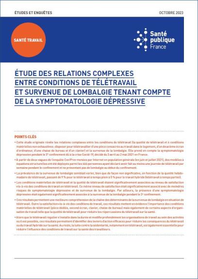 This original study reveals the complex relationships between teleworking conditions (the proportion of time spent teleworking and four non-exhaustive material conditions: having a dedicated workspace in the home, a second computer monitor, an office chair, and a keyboard) and the onset of low back pain. It takes into account depressive symptoms during the third lockdown due to the COVID-19 crisis, which was in effect from April 3 to May 2, 2021, in France. Based on two waves of the CoviPrev survey conducted online among the general population (in June and July 2021), structural equation models were applied to the 466 individuals who reported working from home at least one day per week during the lockdown and who did not have low back pain at the start of the lockdown. The prevalence of low back pain onset appeared to vary, albeit not significantly, depending on the weekly proportion of telework, ranging from 9% for full-time telework to 5% for hybrid work (part-time telework). The physical conditions of remote work and the proportion of remote work were significantly associated with the level of satisfaction with remote work conditions. This same level of satisfaction was significantly associated with a lower risk of depressive symptoms and the onset of low back pain. Furthermore, the presence of depressive symptoms was also significantly associated with the onset of low back pain during the third lockdown. These results provide a better understanding of the chain of determinants leading to the onset of low back pain in a teleworking context. In addition to satisfaction with working conditions, these results highlight the importance of the physical setup for remote work (dedicated room, second screen, keyboard, office chair) as well as certain aspects of work organization, such as the proportion of time spent working remotely, in reducing the health impacts of remote work. As regular telework becomes established over the long term and profoundly alters work organization within sectors where it is feasible, these findings help identify effective levers for action to mitigate the health consequences of telework or hybrid work. Furthermore, combating sedentary behavior—particularly during telework—is also essential for reducing the impact of working conditions on workers’ health.