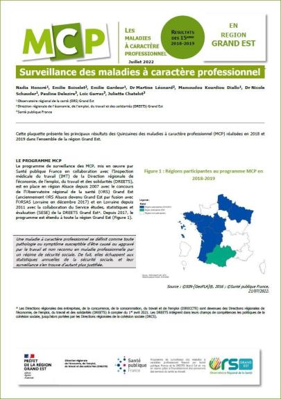 The Occupational Disease Surveillance Program (MCP), implemented by Santé publique France in collaboration with the Occupational Health Inspection (IMT) of the Regional Directorate for the Economy, Employment, Labor, and Solidarity (DREETS), has been in place in the Alsace region since 2007 with the support of the Regional Health Observatory (ORS) Grand Est (formerly ORS Alsace, which became Grand Est following a merger with ORSAS Lorraine in December 2017) and in the Lorraine region since 2011 in collaboration with the Research, Statistics, and Evaluation Service (SESE) of the DREETS Grand Est. Since 2017, the program has been expanded to cover the entire Grand Est region.