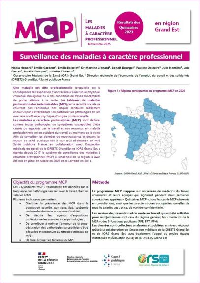 As part of its mission to conduct epidemiological surveillance of occupational risks, Santé publique France is implementing, in collaboration with the Medical Labor Inspection (IMT) of the Ministry of Labor and the regional observatories of participating regions, a system for the epidemiological surveillance of work-related diseases (MCP). The program relies on the voluntary participation of occupational physicians and collaborating physicians in the region, who, with the support of nurses, report all occupational diseases encountered during their consultations with workers over two consecutive weeks known as “MCP Fortnights.” This brochure presents the results of the MCP Fortnights conducted during 2023 in the Grand Est region.