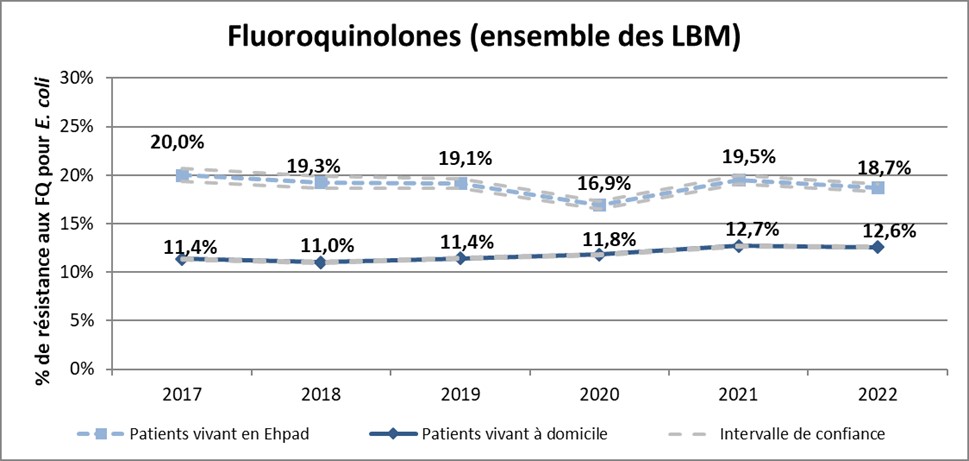 Trends between 2017 and 2022 in the proportion of fluoroquinolone resistance in E. coli isolated from urine samples in patients living at home and in nursing homes, France, Mission Primo