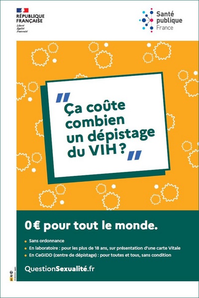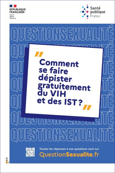 Published in conjunction with Sexual Health Week 2023, this poster encourages people to visit the QuestionSexualite.fr website to learn about free HIV and STI testing. Tagline: "How can I get...