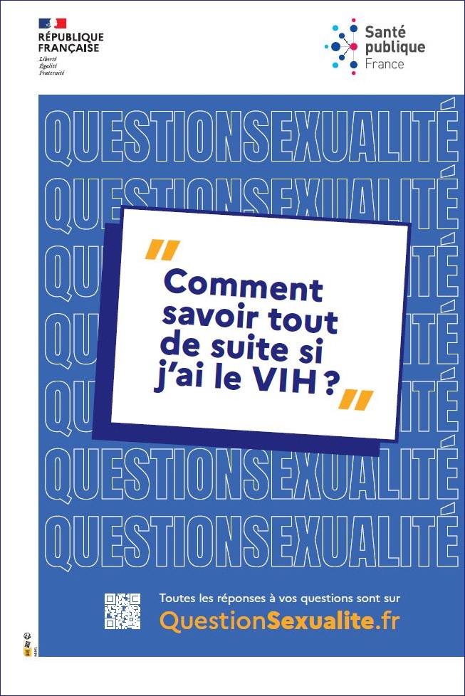 Published in conjunction with Sexual Health Week 2023, this poster encourages people to visit the QuestionSexualite.fr website to learn more about HIV self-tests. Tagline: "How can I find out...