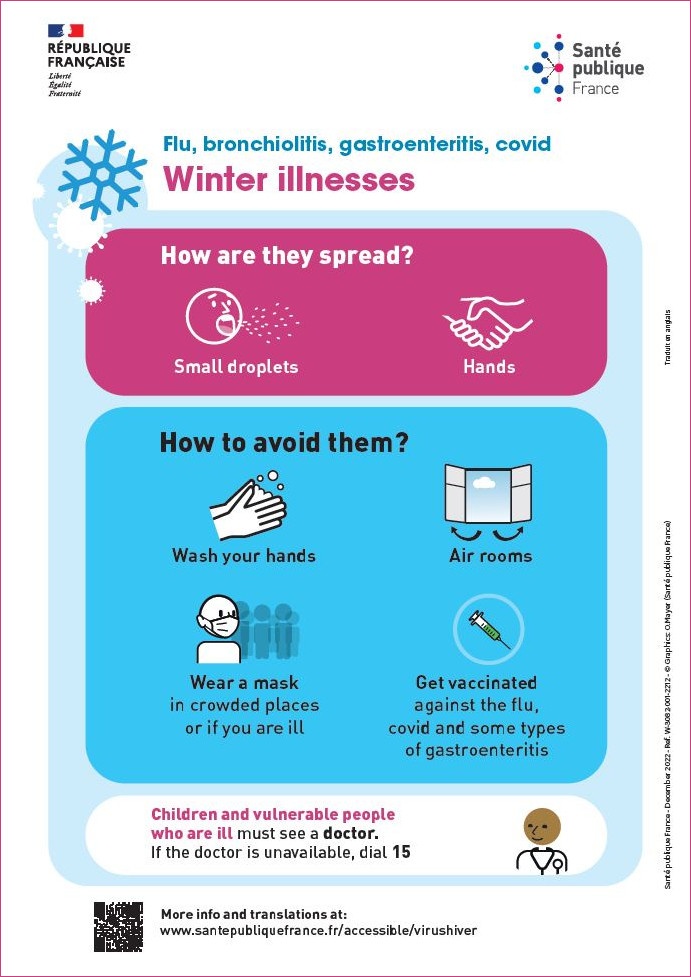 De nombreux virus circulent l'hiver, comme la bronchiolite, la gastro-entérite, la grippe, le covid. Cette affiche d'information sur les maladies de l'hiver, créée collectivement par des...