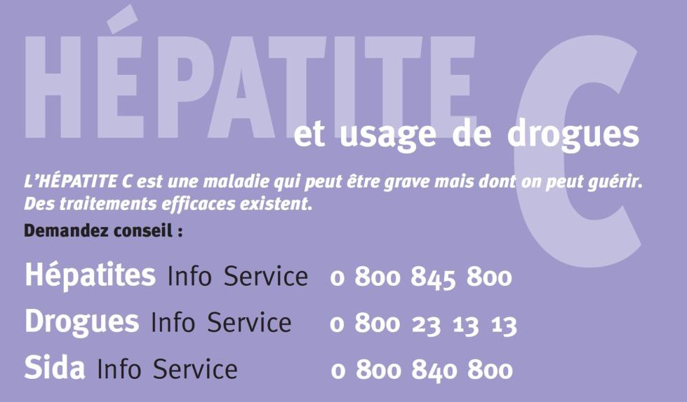 Cette carte destinée aux usagers de drogues alerte sur les dangers de l'hépatite C, incite à un dépistage régulier et rappelle les principaux conseils de réduction des risques infectieux liés à différentes pratiques (injection, sniff, tatouage/piercing). Elle renvoie vers les trois numéros verts Info Services : Hépatites, Drogues et Sida.