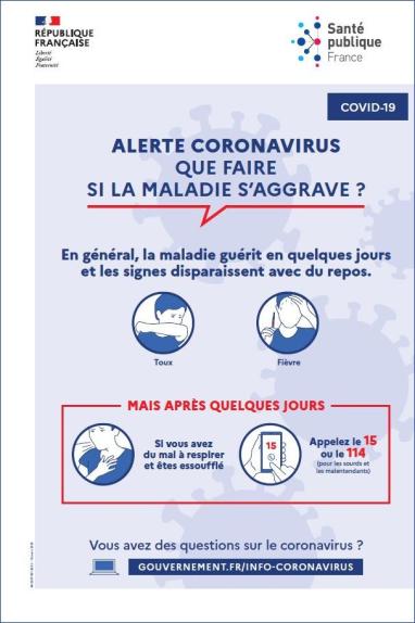 Cette affiche au format Epub3 adaptatif et accessible aux personnes déficientes visuelles indique la conduite à tenir quand on ressent des symptômes graves de la maladie.