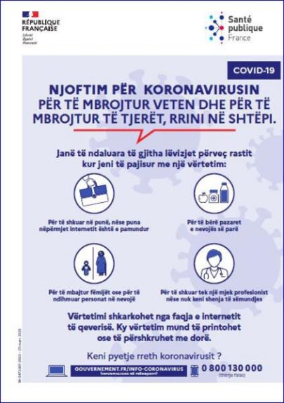 Cette affiche en albanais à destination du grand public indique qu'il faut rester chez soi pour se protéger et protéger les autres du coronavirus (Covid-19), elle précise les cas dans lesquels les déplacements sont autorisés. Titre :