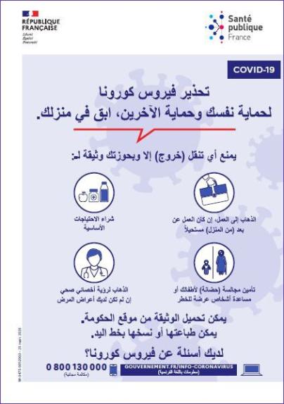 Cette affiche en arabe à destination du grand public indique qu'il faut rester chez soi pour se protéger et protéger les autres du coronavirus (Covid-19), elle précise les cas dans lesquels les déplacements sont autorisés.