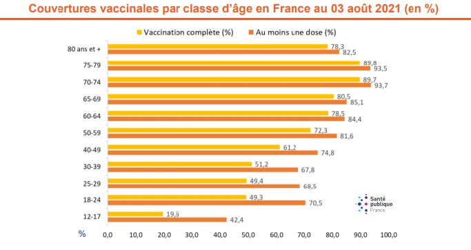 Le 03 août, l’estimation de la couverture vaccinale en France était de 64,5% pour au moins une dose et de 53,8% pour une vaccination complète.