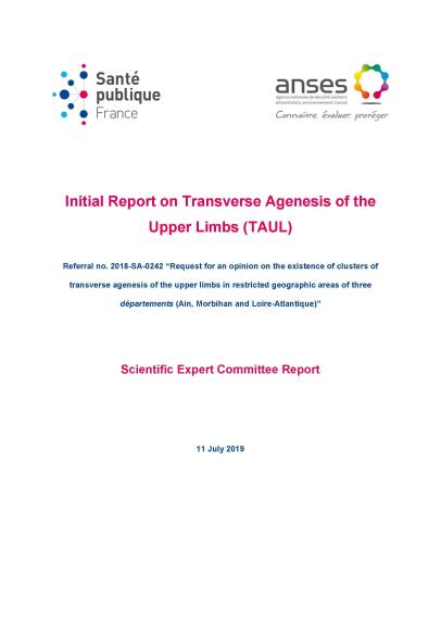 Initial Report on Transverse Agenesis of the Upper Limbs (TAUL). Referral no. 2018-SA-0242 'Request for an opinion on the existence of clusters of transverse agenesis of the upper limbs in restricted geographic areas of three départements (Ain, Morbihan and Loire-Atlantique)'
