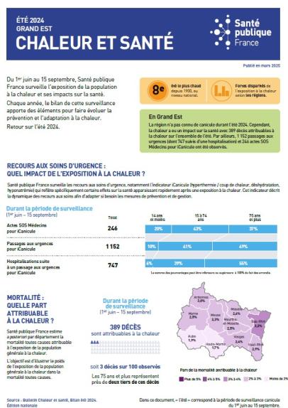 Le Grand Est n'a pas connu de canicule durant l'été 2024. Cependant, la chaleur a eu un impact sur la santé avec 389 décès attribuables à la chaleur sur l'ensemble de l'été. Par ailleurs, 1 152 passages aux urgences (dont 747 suivis d'une hospitalisation) et 246 actes SOS Médecins pour iCanicule ont été observés.