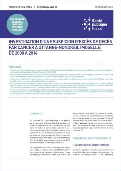 Le 4 octobre 2016, une association et un syndicat de la commune d'Ottange-Nondkeil alertaient le préfet du département de la Moselle sur la présence de radon en concentrations élevées mesurées dans certaines caves des cités minières de la commune et sur un nombre anormalement élevé de décès par cancers suspectés d'être en lien avec ces concentrations en radon. Le signal sanitaire ayant été validé, l'ARS Grand Est a sollicité Santé publique France pour confrmer ou infrmer cette suspicion d'excès de décès par cancers regroupés dans le temps et sur le territoire de cette commune. Cette synthèse présente les résultats de cette investigation.