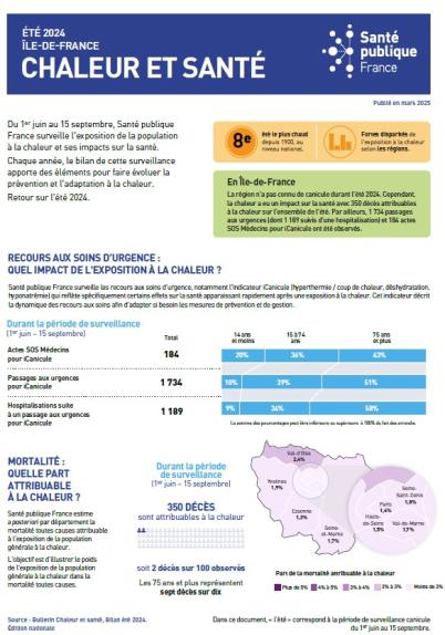 La région Île-de-France n'a pas connu de canicule durant l'été 2024. Cependant, la chaleur a eu un impact sur la santé avec 350 décès attribuables à la chaleur sur l'ensemble de l'été. Par ailleurs, 1 734 passages aux urgences (dont 1 189 suivis d'une hospitalisation) et 184 actes SOS Médecins pour iCanicule ont été observés.