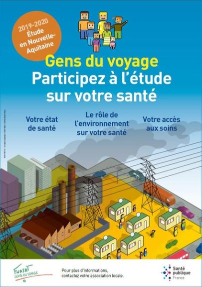Affiche destinée aux associations partenaires, impliquées dans mise en oeuvre de l'étude sur la santé des Gens du voyage en Nouvelle-Aquitaine. Elle sera utilisée lors des réunions et événements organisés pendant le déroulement de l'étude (novembre 19/juin 20).