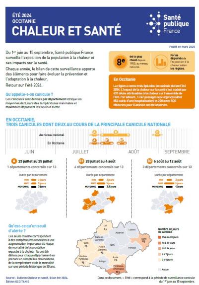 La région a connu trois épisodes de canicule durant l'été 2024. L'impact de la chaleur sur la santé s'est traduit par 437 décès attribuables à la chaleur sur l'ensemble de l'été. Par ailleurs, 1 247 passages aux urgences (dont 854 suivis d'une hospitalisation) et 220 actes SOS Médecins pour iCanicule ont été observés. Lien vers le bulletin Chaleur et santé en Occitanie. Bilan de l'été 2024.