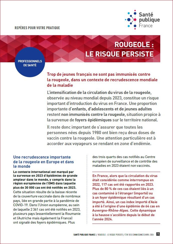 Ce document destiné aux professionnels de santé permet de faire un point épidémiologique, clinique et diagnostique dans un contexte de recrudescence mondiale de la rougeole. État des connaissances...