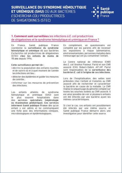 Ce flyer informe sur le dispositif de surveillance du syndrome hémolytique et urémique (SHU) coordonné par Santé publique France, sur le rôle des différents partenaires et sur la mise en place d'investigations épidémiologiques.