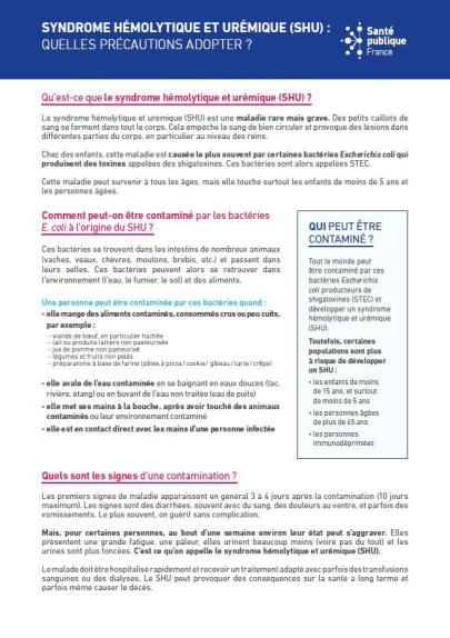 Le syndrome hémolytique et urémique (SHU) est une complication rare mais grave des infections aux bactéries Escherichia coli producteurs de shigatoxines (STEC). Ce document répond aux questions essentielles qui peuvent se poser à ce sujet : Quels sont les signes d'une infection à STEC et d'un SHU ? Quelles sont les populations à risque de cette maladie ? Comment peut-on se contaminer par ces bactéries ? Quels gestes pour prévenir ces infections ?