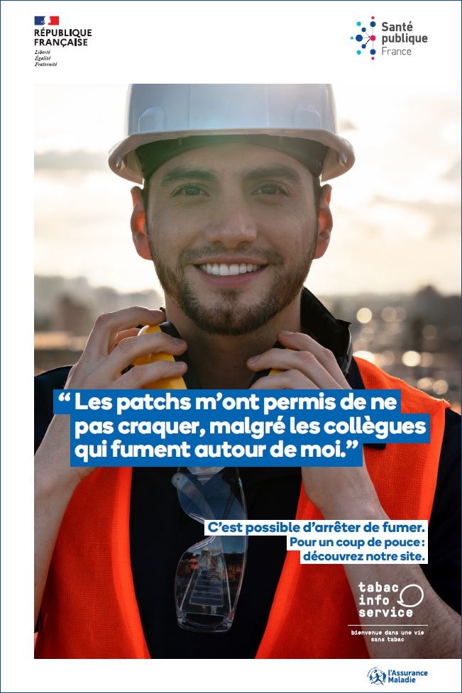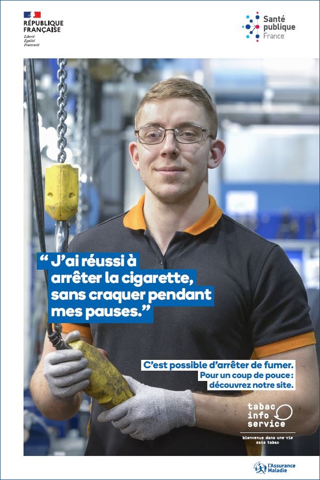 Affiche incitant à arrêter de fumer et faisant la promotion des aides à l'arrêt de Tabac info service, en milieu professionnel de l'industrie et de la production.