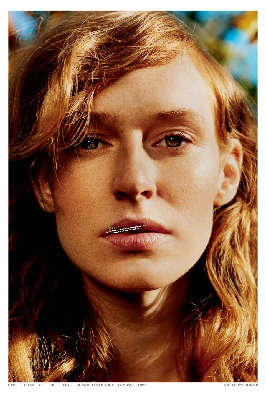 Affiche de lutte contre la discrimination des personnes séropositives. Le visuel incite le spectateur à se rapprocher d'un visage (ici une jeune femme rousse) pris en gros plan afin de pouvoir...