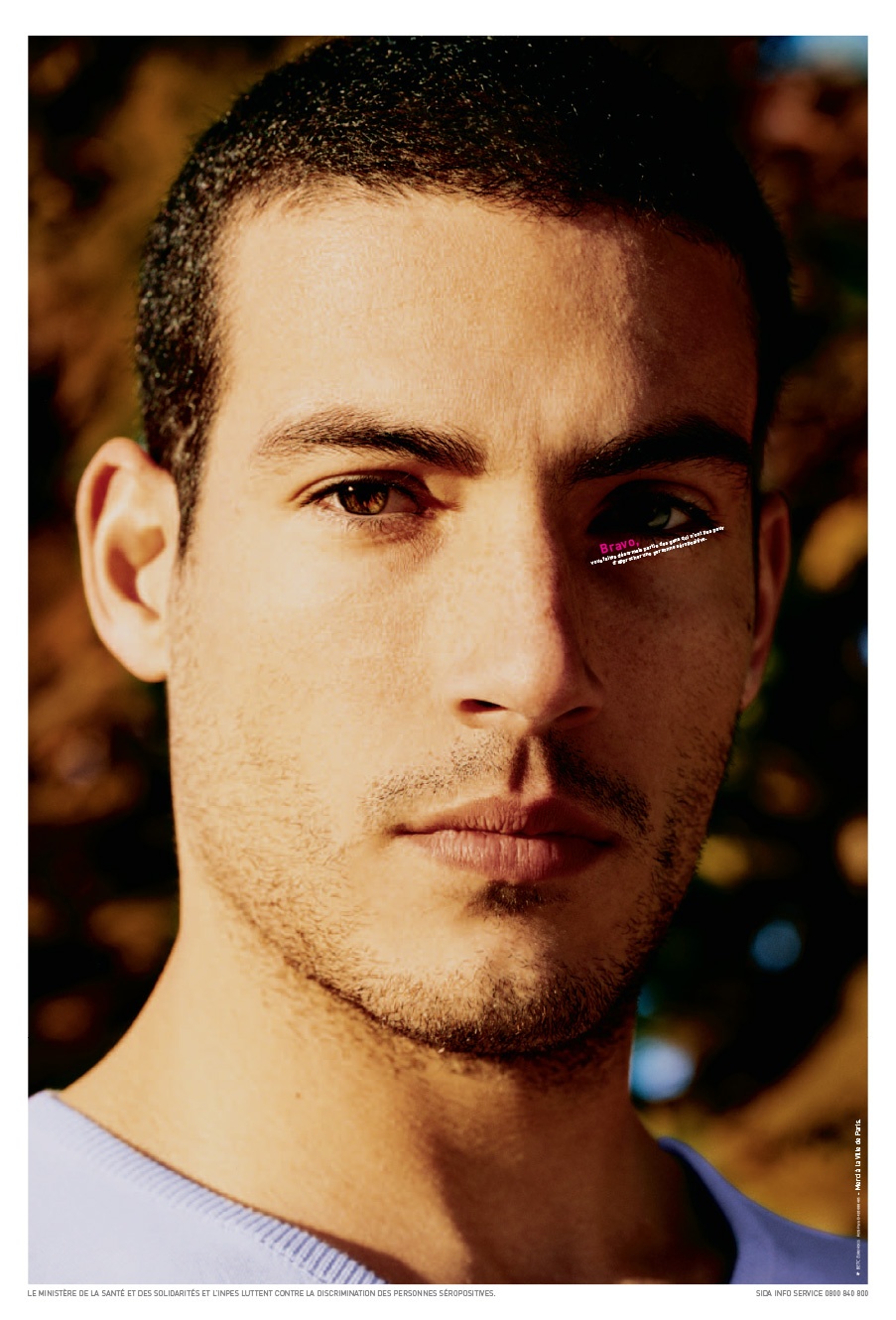 Affiche de lutte contre la discrimination des personnes séropositives. Le visuel incite le spectateur à se rapprocher d'un visage (ici un jeune d'origine maghrébine) pris en gros plan afin de...