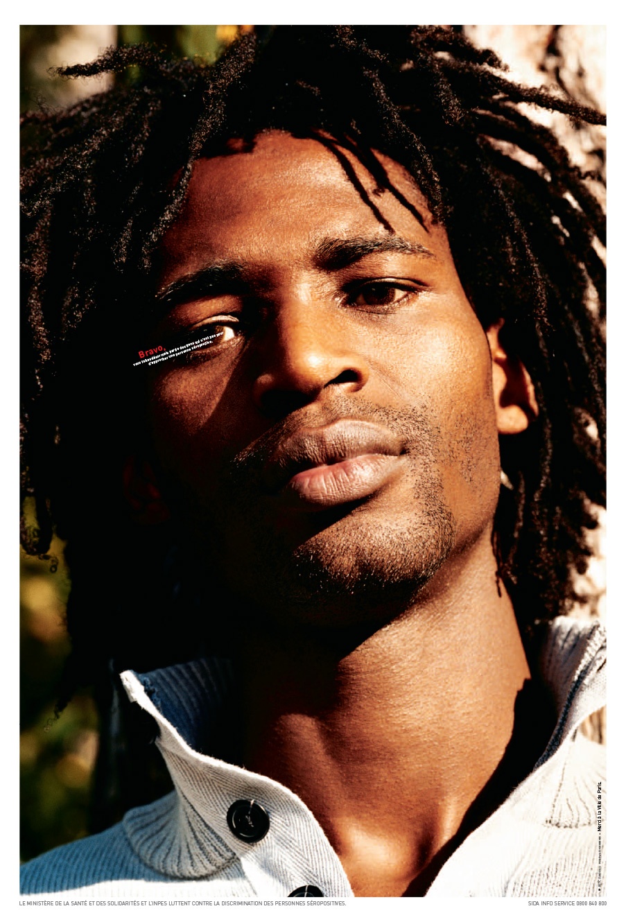 Affiche de lutte contre la discrimination des personnes séropositives. Le visuel incite le spectateur à se rapprocher d'un visage (ici un jeune noir) pris en gros plan afin de pouvoir lire le...