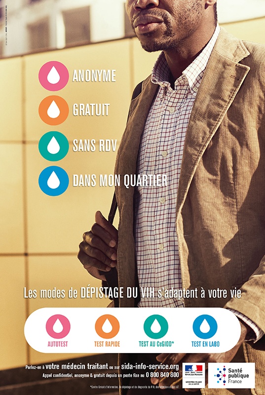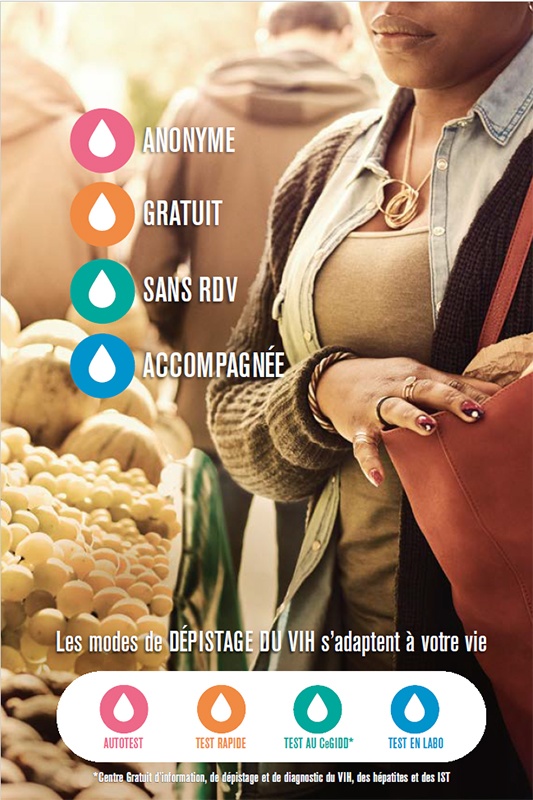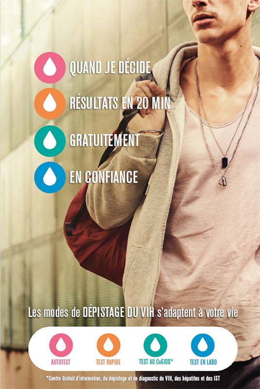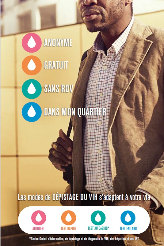 "Anonyme - Gratuit - Sans RDV - Accompagnée" : l'affiche présente les différents modes de dépistage du VIH : autotest, test rapide, test dans un Cegidd (Centre Gratuit d'information, de dépistage...