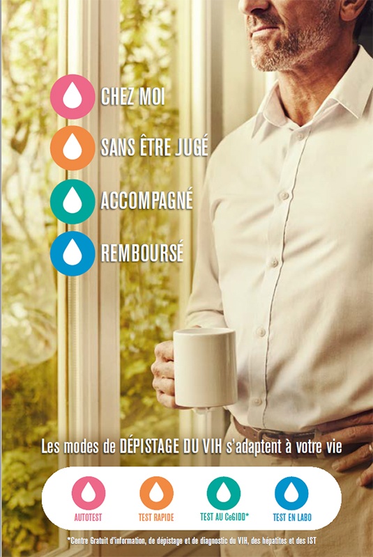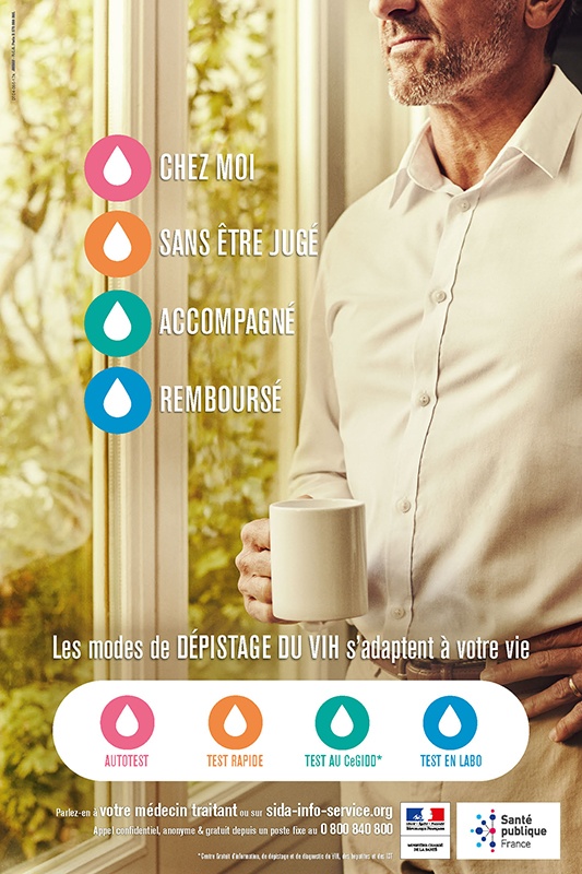 "Chez moi - Sans être jugé - Accompagné - Remboursé" : l'affiche présente les différents modes de dépistage du VIH : autotest, test rapide, test dans un Cegidd (Centre Gratuit d'information, de...